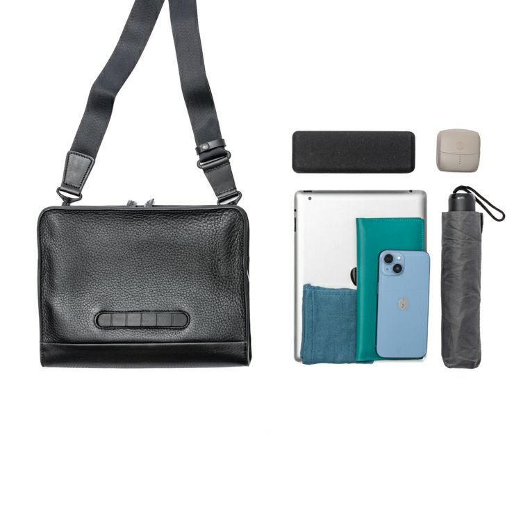 財布やスマホなど貴重品のほか、手回り品一式が収まるサイズ感。A5サイズまでのタブレットも収納可能で、バッグインバッグとしても使用いただけます。
