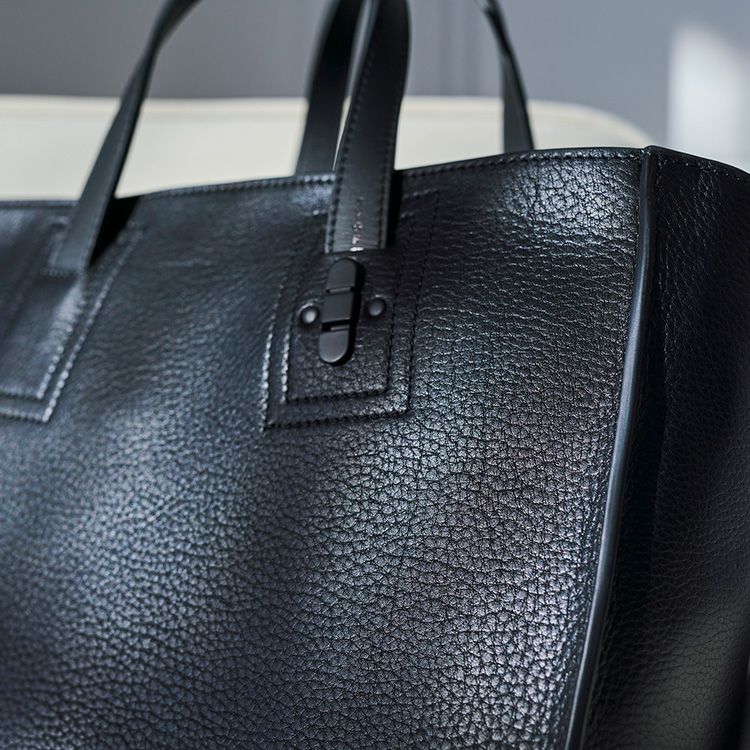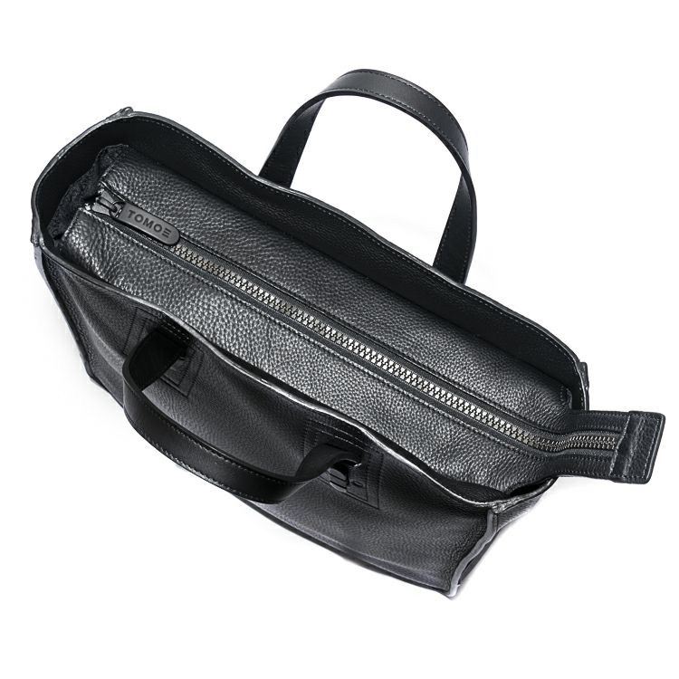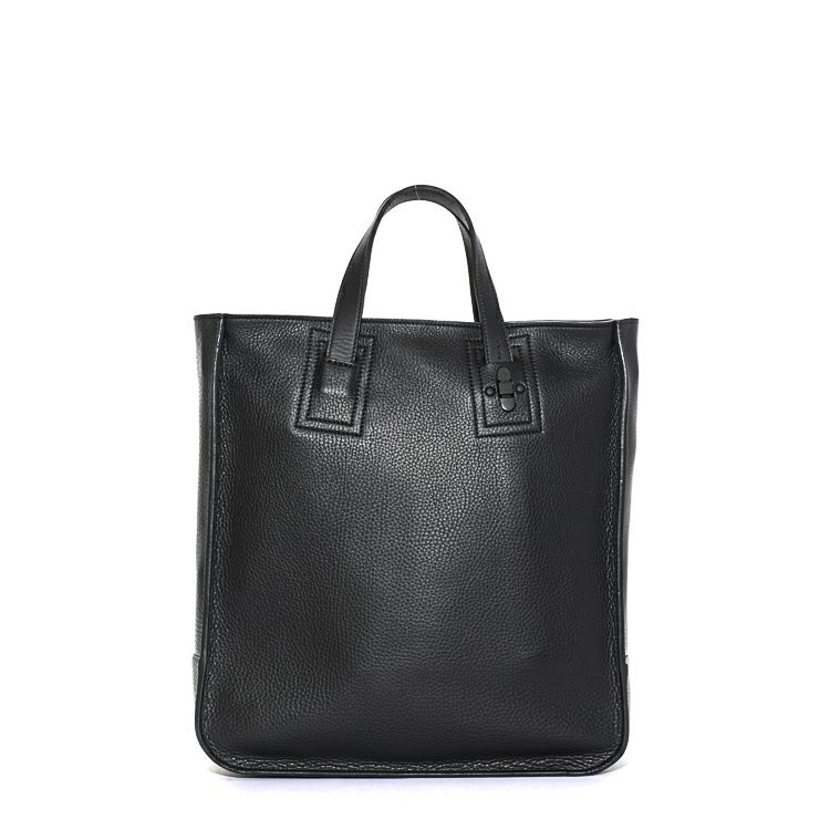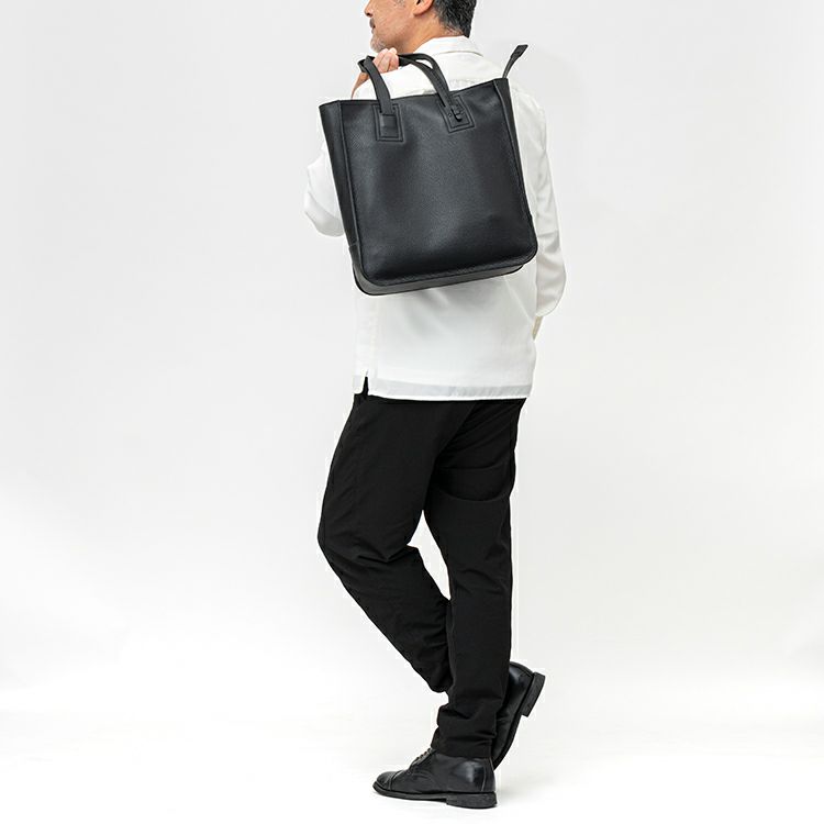 肉厚なシボ革の上質感を引き出す、スタイリッシュに仕上げた縦型レザートートバッグ。自立可能な底マチを確保し、A4ファイルや13インチPC・手回り品を持ち運べる収納力を確保。