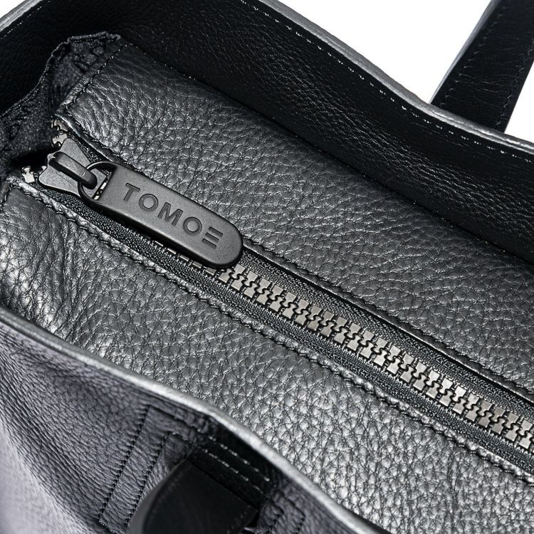 革のエッジ(断面部)は厚みのあるコバ塗りを採用。何層にも塗り重ね磨き上げた職人技で、重厚感と美しい光沢を生み出し、TOMOEのミニマルでシャープなフォルムを際立たせています。