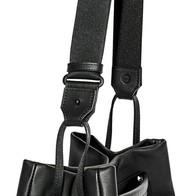 肌当たりの良い上質なソフトレザーの肌触りと、柔らかさを生かした丸みを帯びたフォルムが特徴。取り外し可能なベルトでショルダーに、ハンドルを持ち上げれば手持ちになる2Way仕様。ショルダーとハンドルそれぞれを引っ張ると自然と開口部が閉じる、実用性も考え抜かれた構造です。