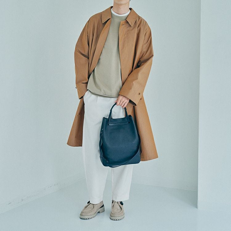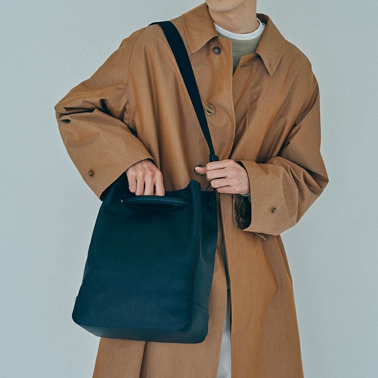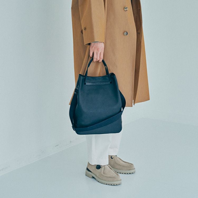 ハンドルを持ち上げるとTOMOEのロゴが顔を出します。構造のほぼ全てを革にすることで、軽さも実現。オンオフ、ジェンダーを問わない普遍性を兼ね備えたデイリーバッグです。