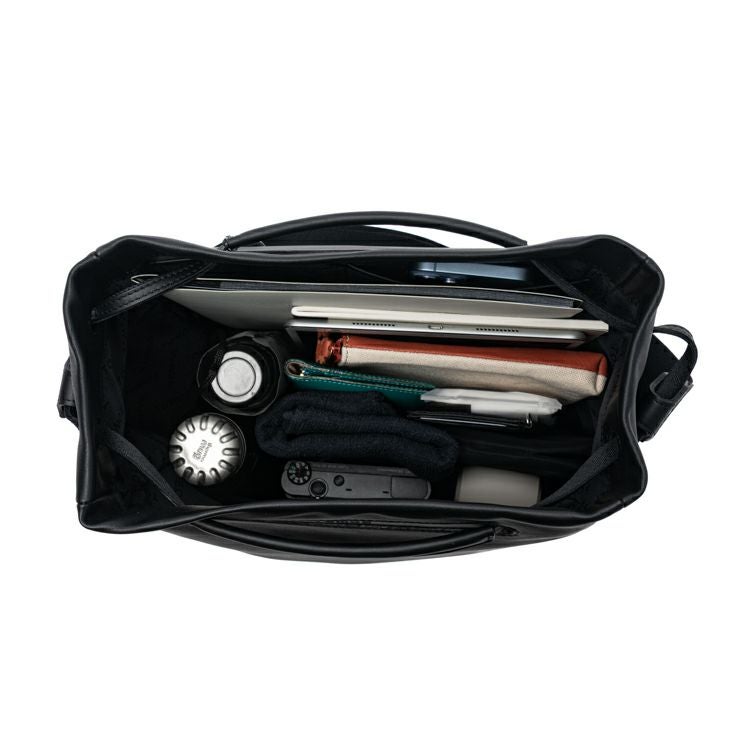 A4ファイルが入る大きさで、ノートやタブレットはもちろん、ポーチやタンブラー、折りたたみ傘、カメラ、名刺入れ、ハンカチなど、ビジネスからプライベートまで必要なアイテムをすっきりと収納できます。