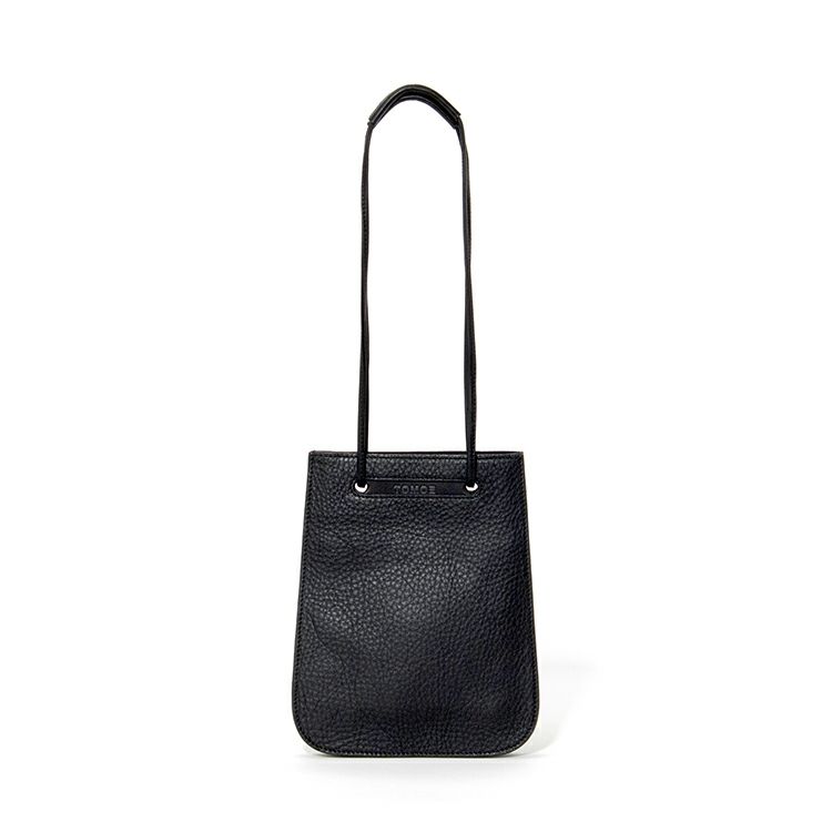 マチは2つのパーツが中央で折り込まれた構造で、収納に合わせてマチが変化します。開口部に留め具の無いシンプルな作りながら、ストラップによって自然と絞られる巾着型が特徴。
