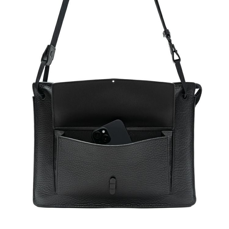 バッグ内部に薄めのクッション材を内蔵し、PCやタブレットの衝撃緩和も考慮したつくりに。バッグ正面のマチ付きのフラップポケットは、スマホはもちろん、ガジェットやマウスも収納可能。スリムながら仕事道具一式を持ち運べるため、通勤用のビジネスバッグとしても活躍します。