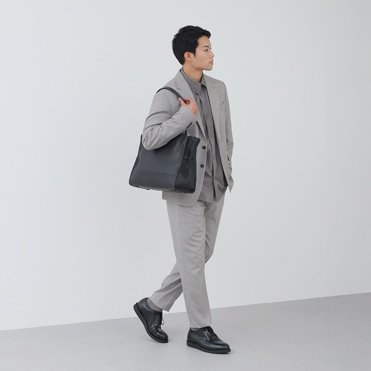 枠にとらわれないビジネスパーソンに向けた、新しいワークスタイルを提案する、2Wayレザートートバッグ。A4サイズ対応で、内側に施したマチ幅調整ベルトで荷物に合わせてフォルムを変えられます。