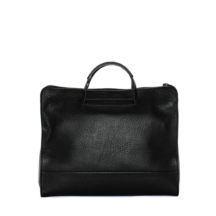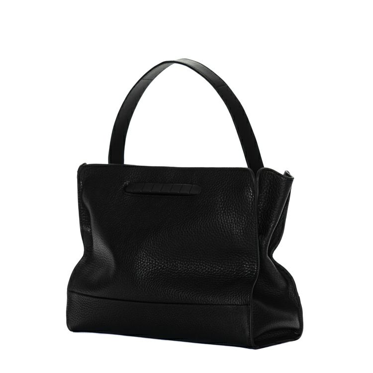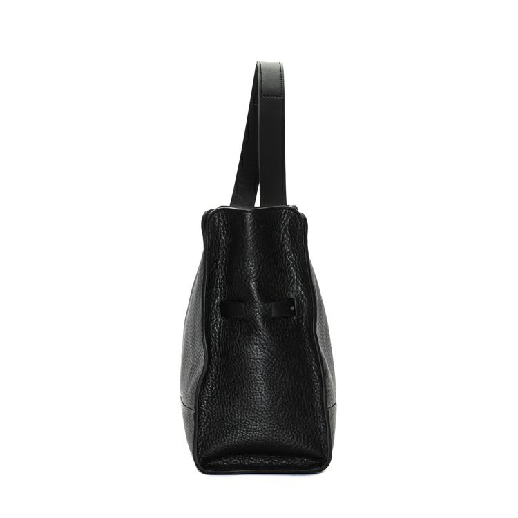 取り外し可能なヌメ革素材のショルダーストラップでトートに、バッグ上部のハンドルを使って手持ちでと、スタイルによって持ち方を変えられます。バッグ内側にマチ幅を絞る調整ベルト付きで、荷物が少ない際にマチ幅を絞り、シボ革のしなやかさが生み出す独特のドレープを楽しむもおすすめ。底面にはオリジナルの底鋲付きで床置きも安心。