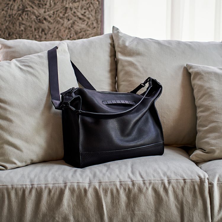 クラフトマンシップの象徴の一つが、柔らかな風合いのシボ革のエッジ(断面部)に施したコバ仕様。バッグ作りの常識では考えられないほど何層にも塗り重ね、手間をかけて磨き上げることで、重厚感と美しい光沢を生み出し、ミニマルなフォルムを際立たせます。