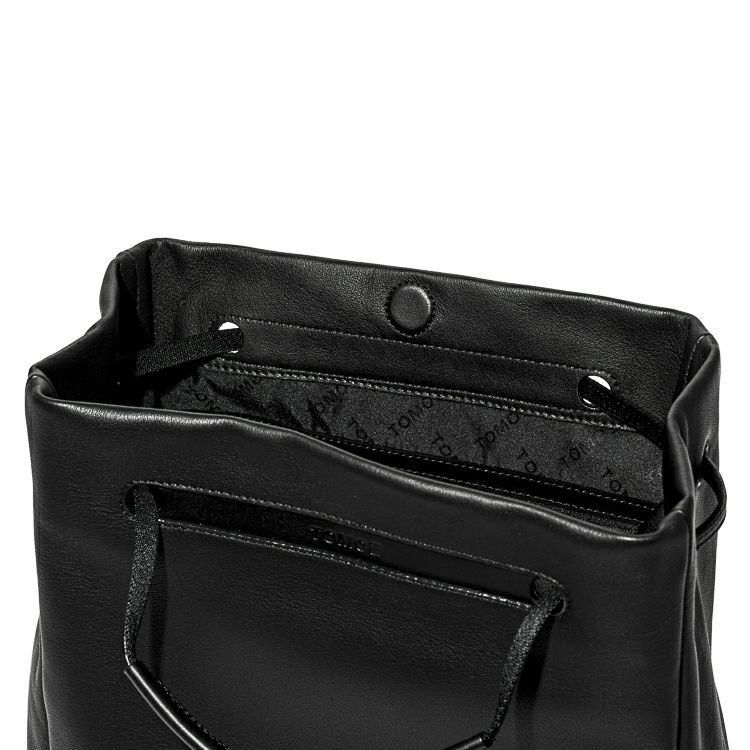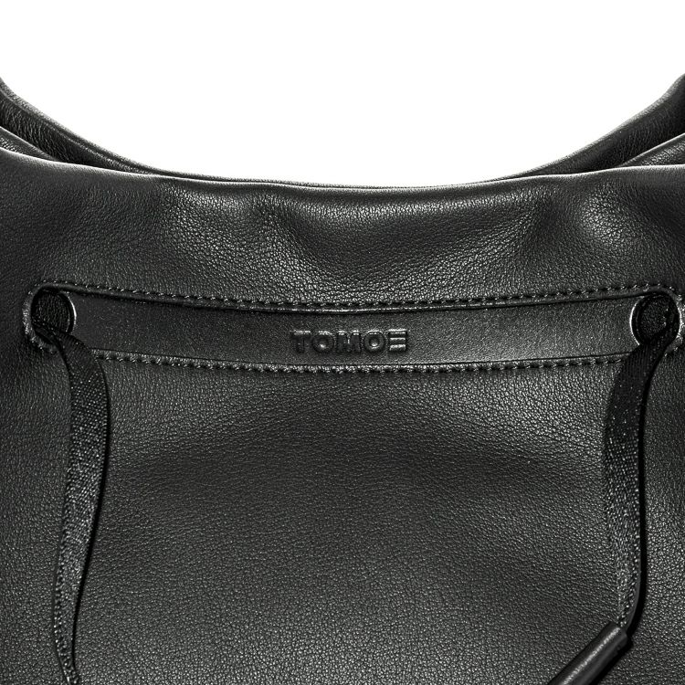 ハンドルを持ち上げるとTOMOEのロゴが顔を出します。構造のほぼ全てを革にすることで、軽さも実現。オンオフ、ジェンダーを問わない普遍性を兼ね備えたデイリーバッグです。