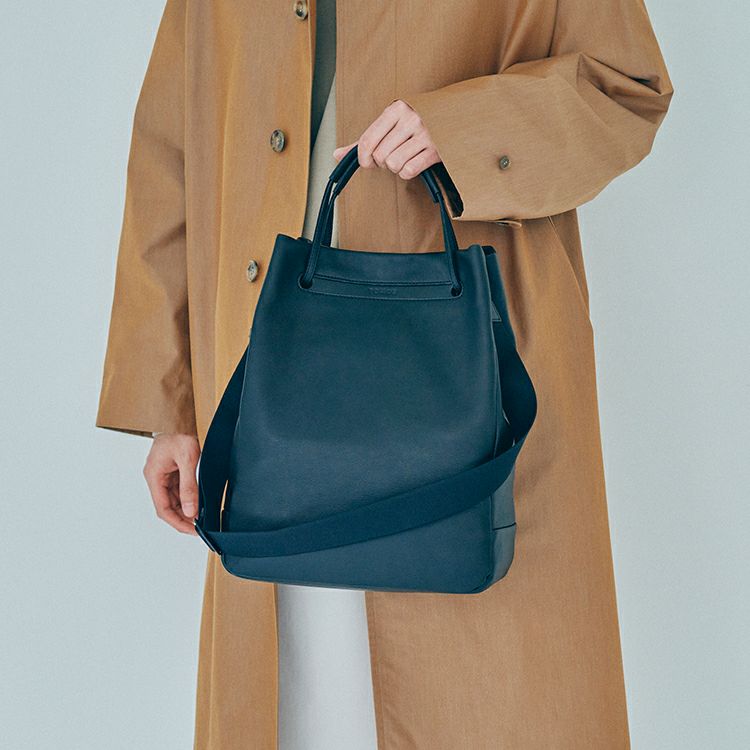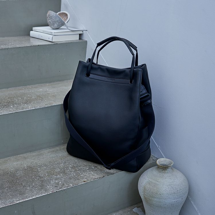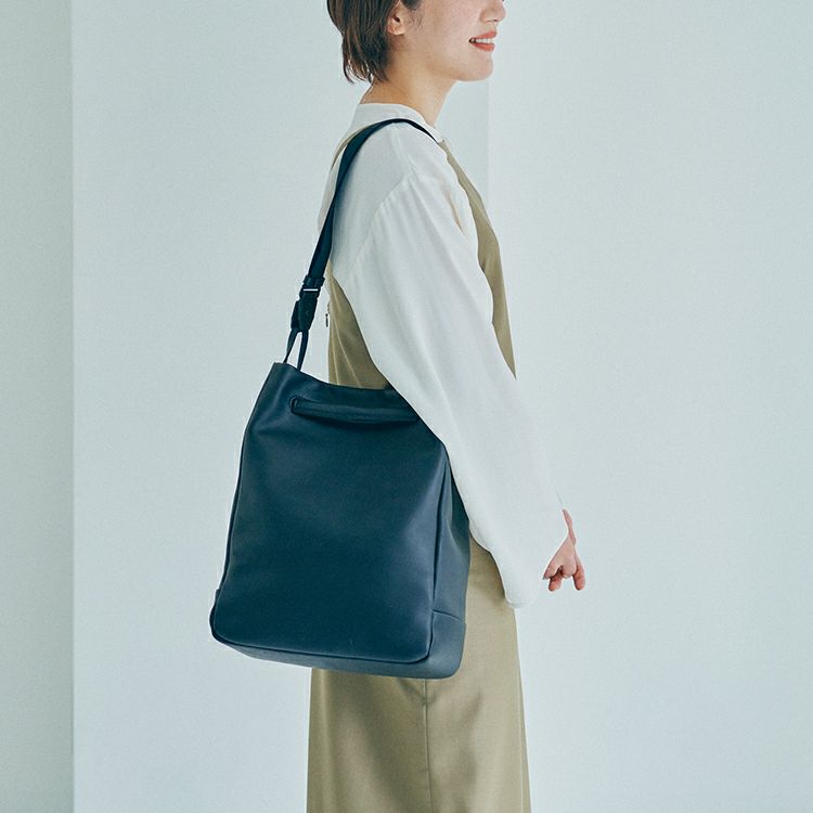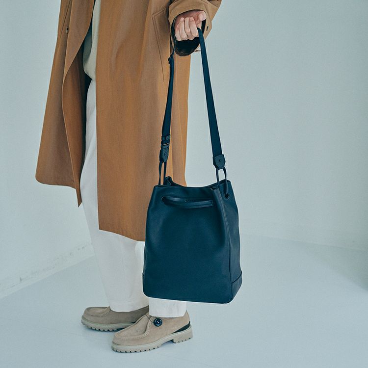 肌当たりの良い上質なソフトレザーの肌触りと、柔らかさを生かした丸みを帯びたフォルムが特徴。取り外し可能なベルトでショルダーに、ハンドルを持ち上げれば手持ちになる2Way仕様。ショルダーとハンドルそれぞれを引っ張ると自然と開口部が閉じる、実用性も考え抜かれた構造です。