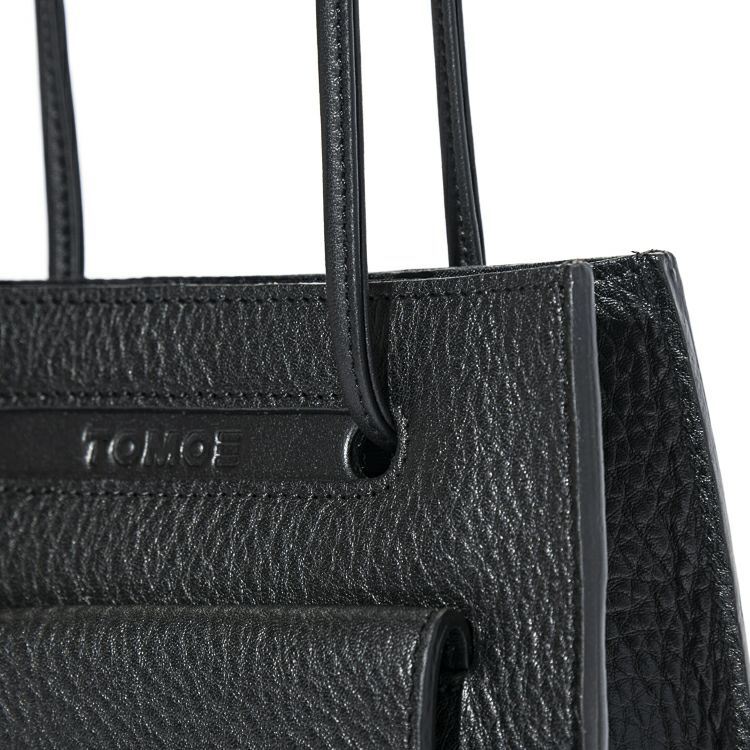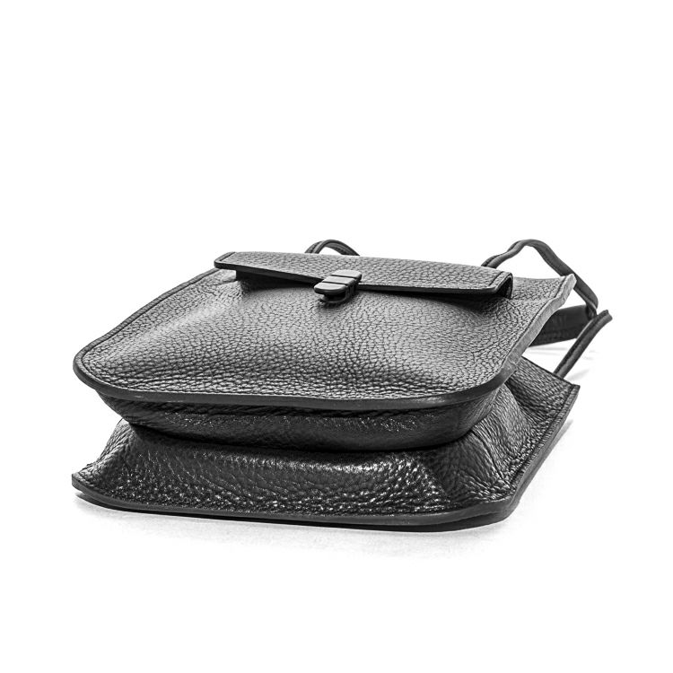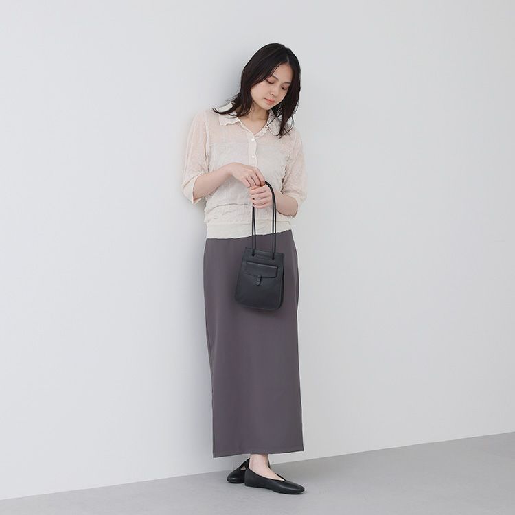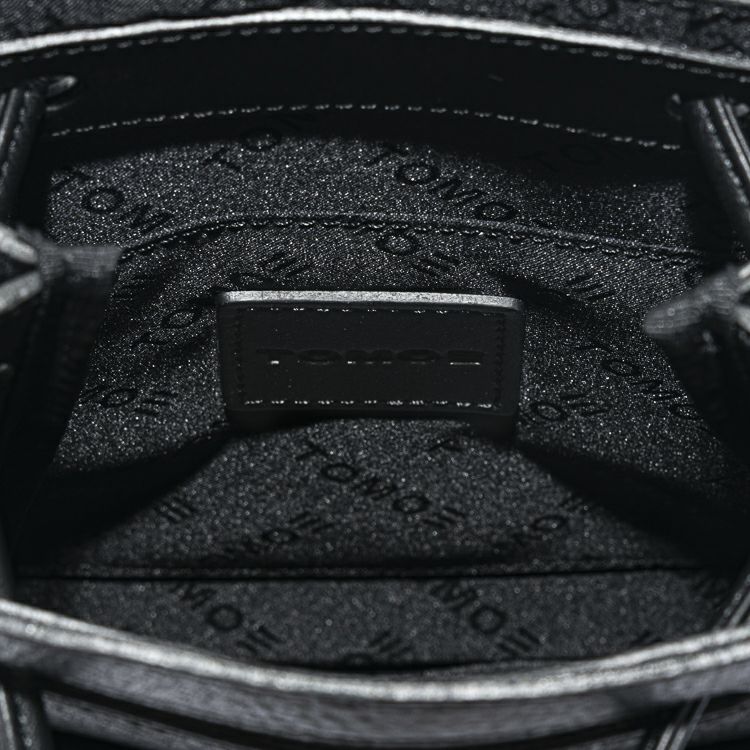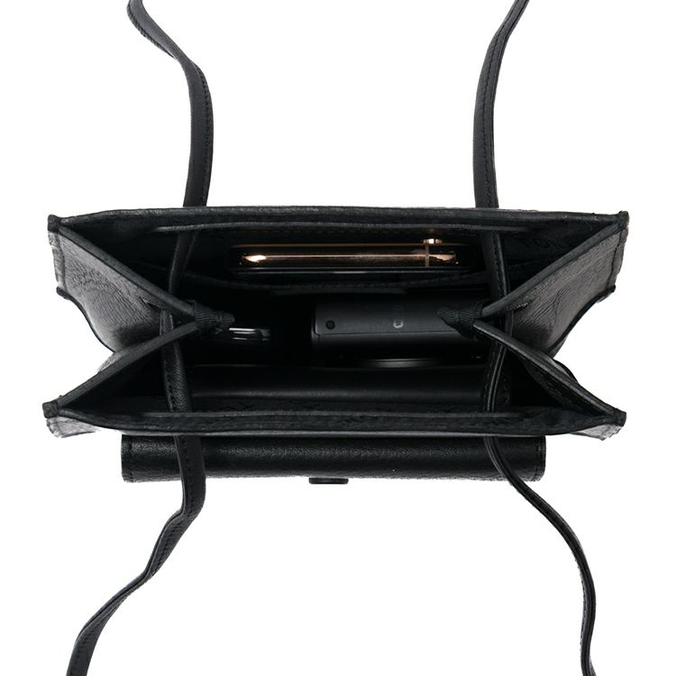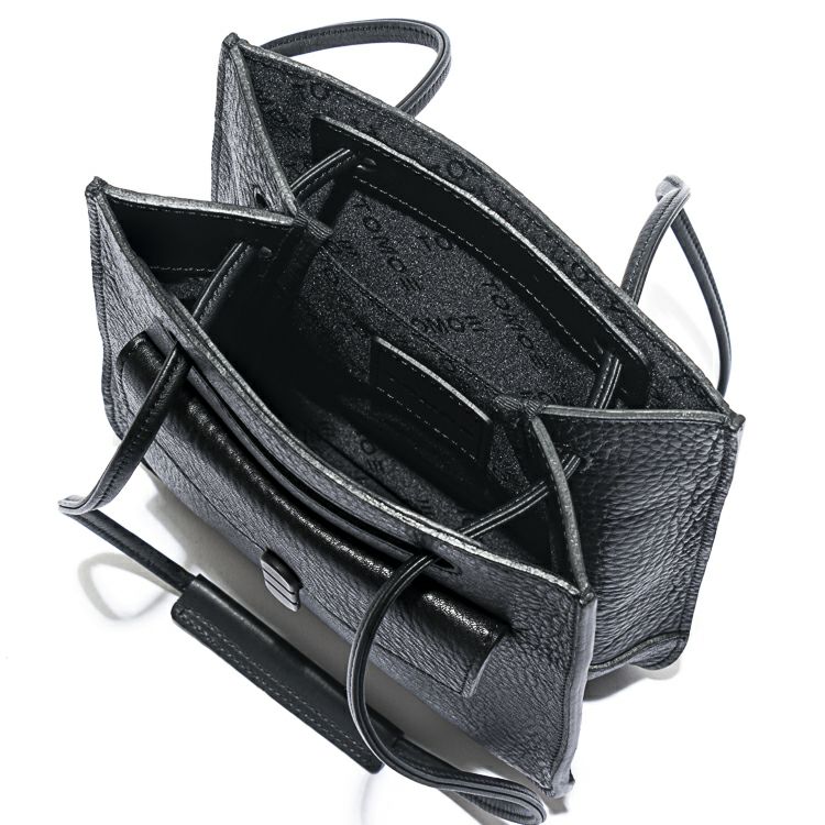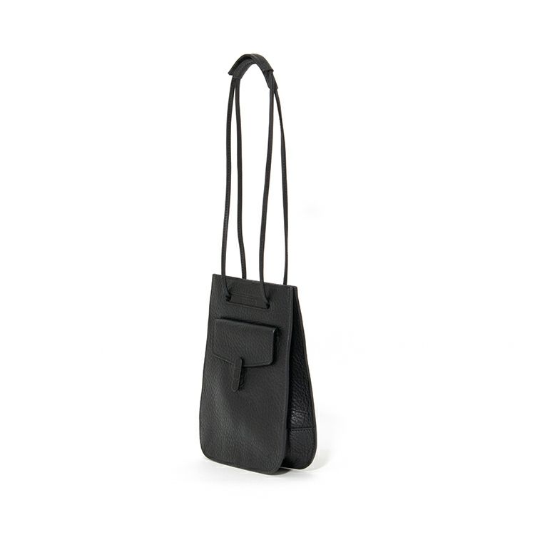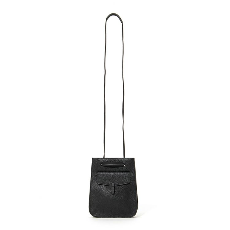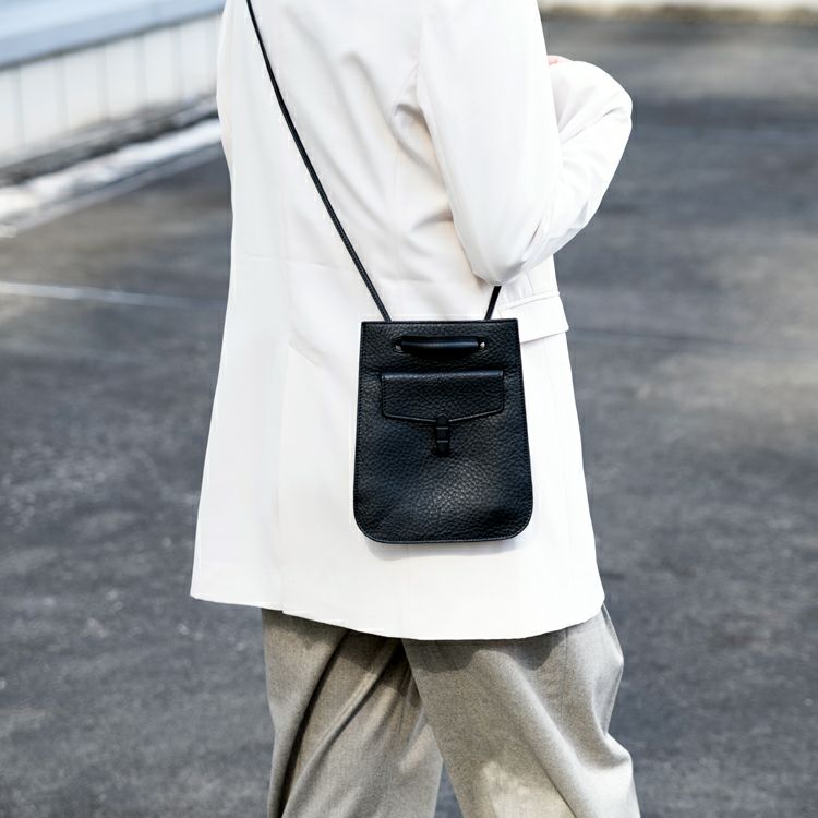 マチは2つのパーツが中央で折り込まれた構造で、収納に合わせてマチが変化します。開口部に留め具の無いシンプルな作りながら、ストラップによって自然と絞られる巾着型が特徴。