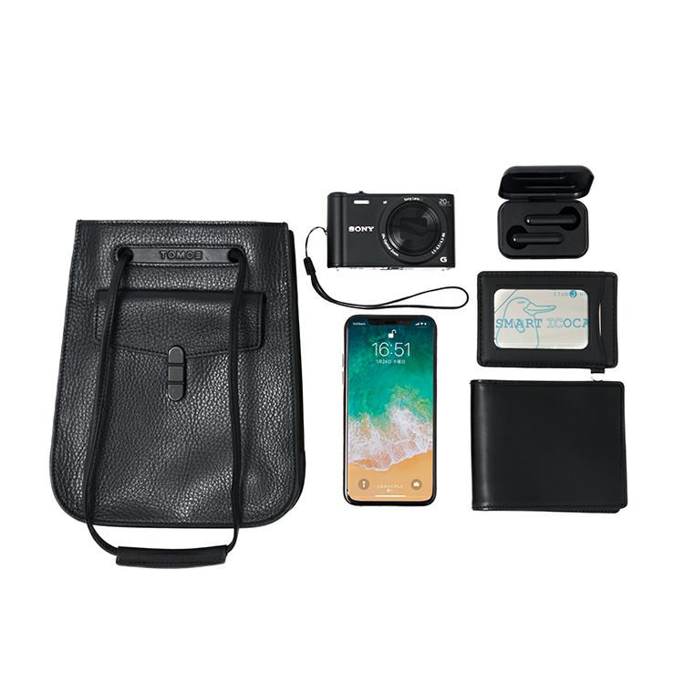 必需品に加え、コンパクトカメラなどが収まる見た目以上の収納力。スマホや財布、鍵などの小物もスッキリ収まります。内装には小さなオープンポケット付き。