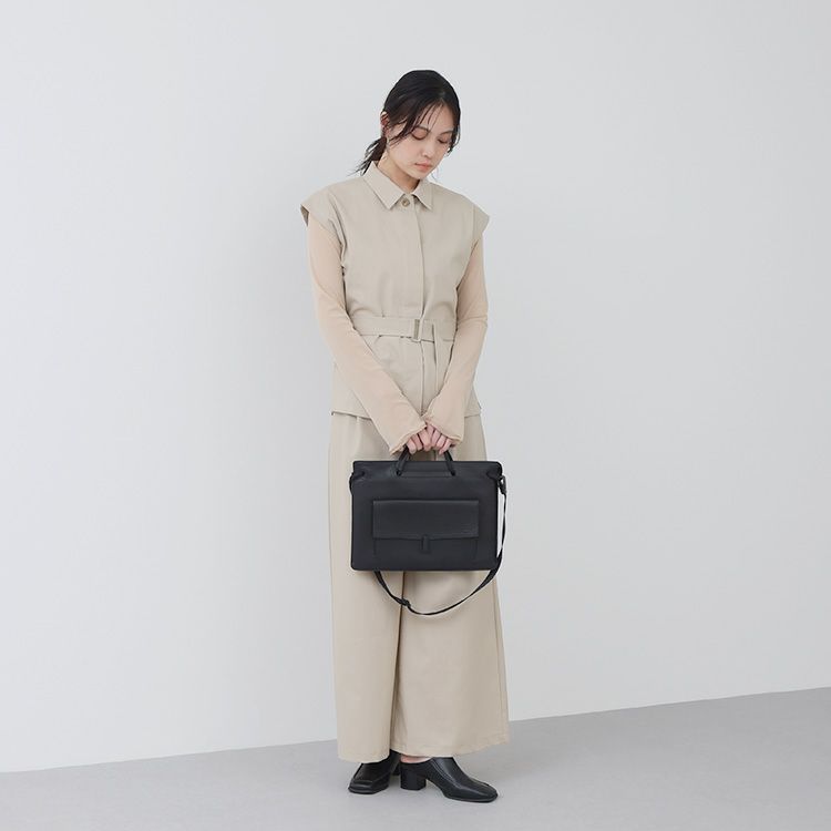 13インチPCがぴったり収まるサイズ感の2WAYショルダー。ショルダーベルトとハンドルが連結した構造で、ショルダー使いの際はハンドルが自然と収納され、手提げで使用する際はハンドルを引き上げるだけでOK。また、ショルダーベルトは取り外し可能で、スリムなブリーフケース使いも可能。