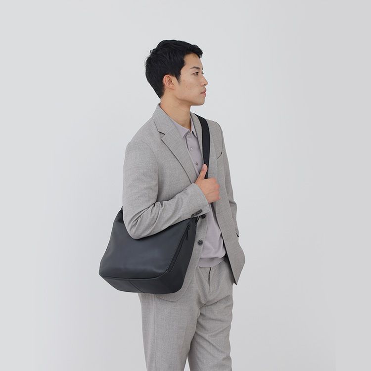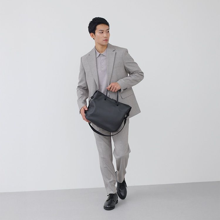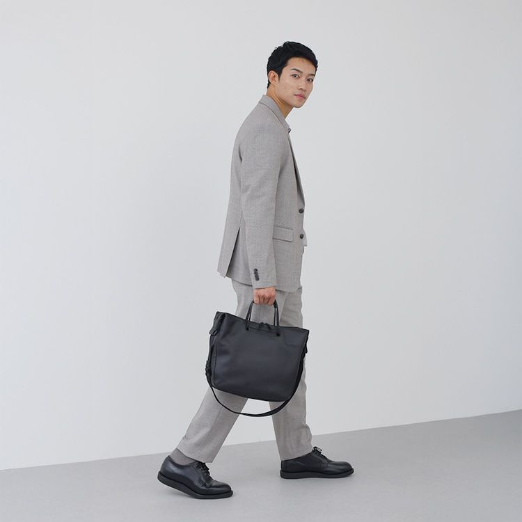ショルダーベルトとハンドルが一体化した構造で、手持ちの際にハンドルを引き上げると、連結されたショルダーベルトの根元が自然と垂れ下がり、手持ちしやすいフォルムに変化。TOMOEらしい使いやすさを兼ね備えたギミックです。薄くしなやかなソフトレザーを使うことで、軽さも実現。オンオフ、ジェンダーを問わずお使いいただけます。