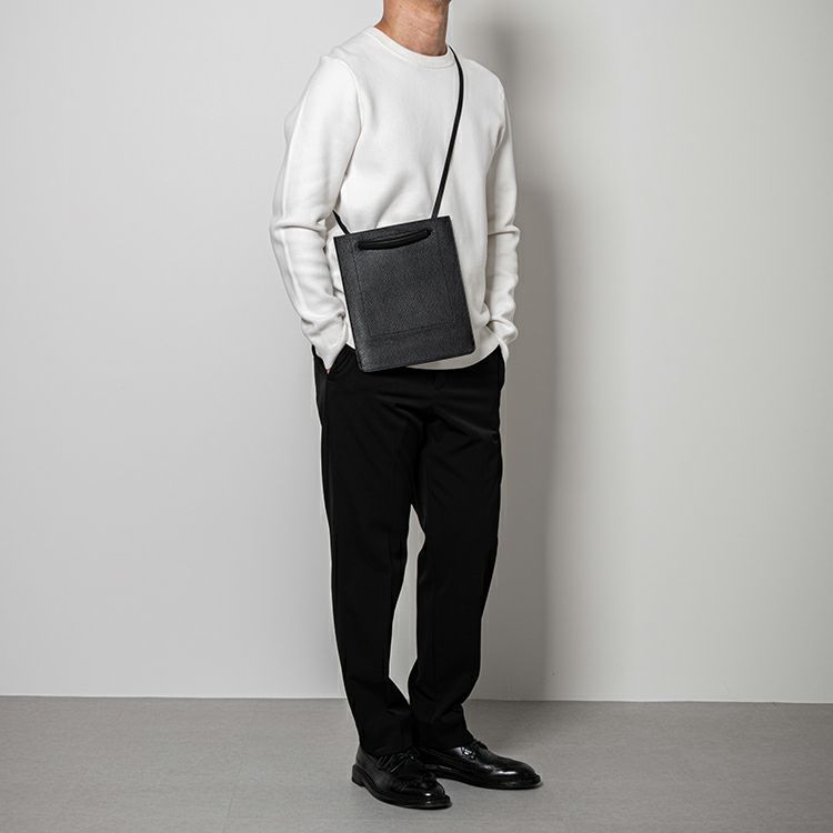 スリムで計算されたフォルムでミニマルさが引き立つ2WAYショルダー。シボの凹凸感が上品なイタリアの型押しレザーを使用。シンプルでスマートなフォルムが際立つデザインに。