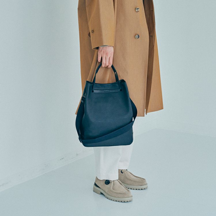 ハンドルを持ち上げるとTOMOEのロゴが顔を出します。構造のほぼ全てを革にすることで、軽さも実現。オンオフ、ジェンダーを問わない普遍性を兼ね備えたデイリーバッグです。