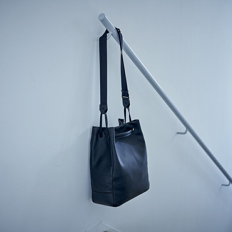 肌当たりの良い上質なソフトレザーの肌触りと、柔らかさを生かした丸みを帯びたフォルムが特徴。取り外し可能なベルトでショルダーに、ハンドルを持ち上げれば手持ちになる2Way仕様。ショルダーとハンドルそれぞれを引っ張ると自然と開口部が閉じる、実用性も考え抜かれた構造です。
