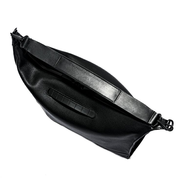 クラフトマンシップの象徴の一つが、柔らかな風合いのシボ革のエッジ(断面部)に施したコバ仕様。バッグ作りの常識では考えられないほど何層にも塗り重ね、手間をかけて磨き上げることで、重厚感と美しい光沢を生み出し、ミニマルなフォルムを際立たせます。