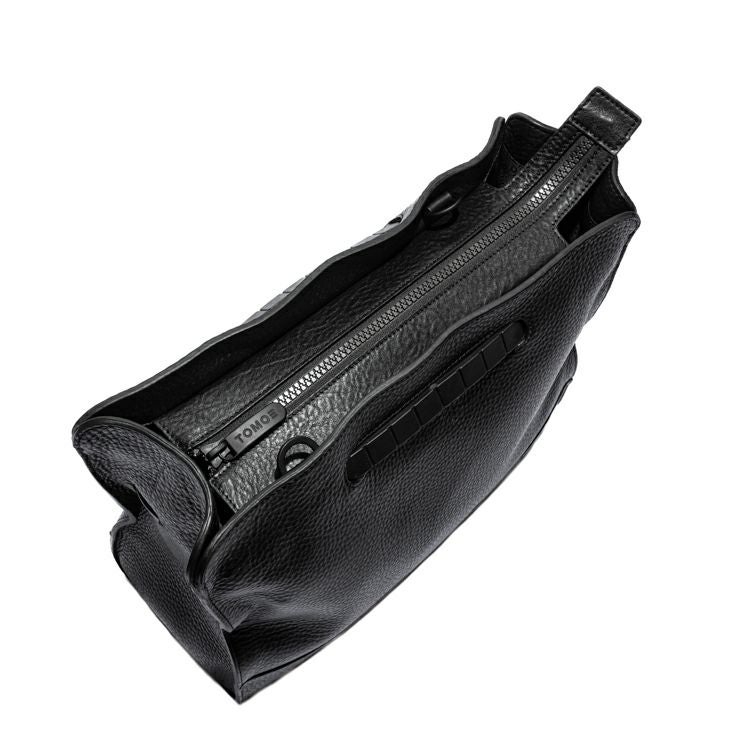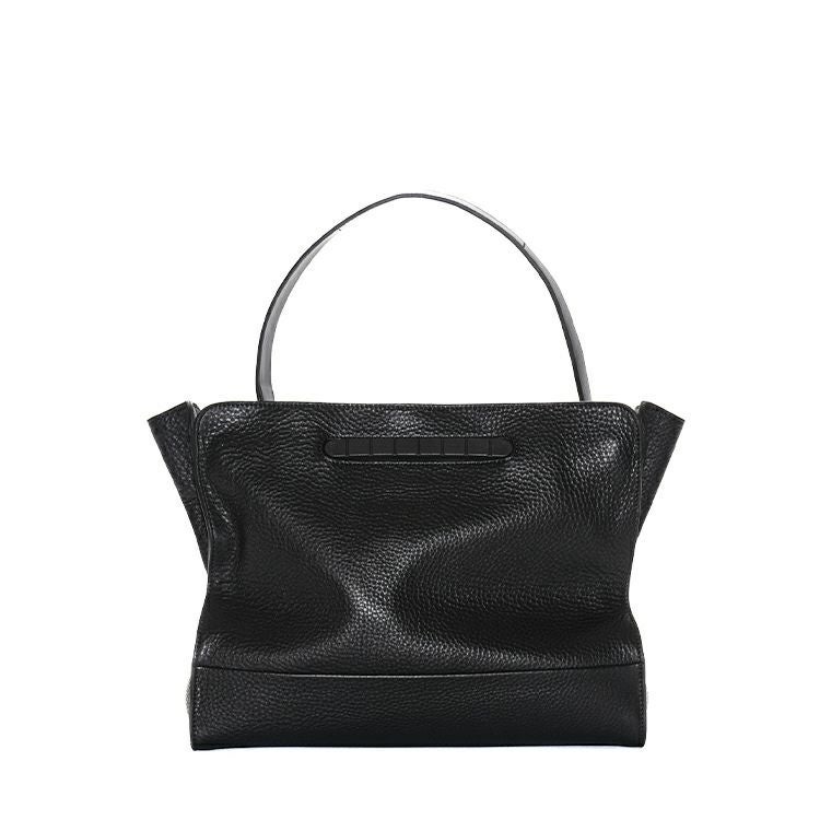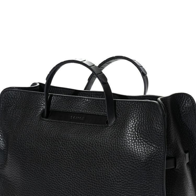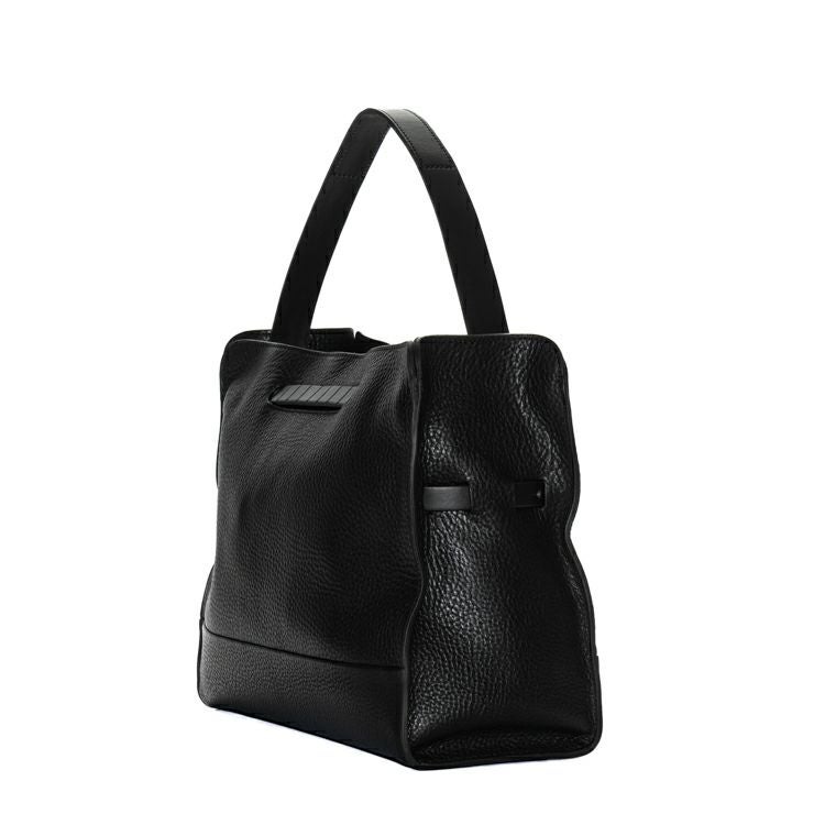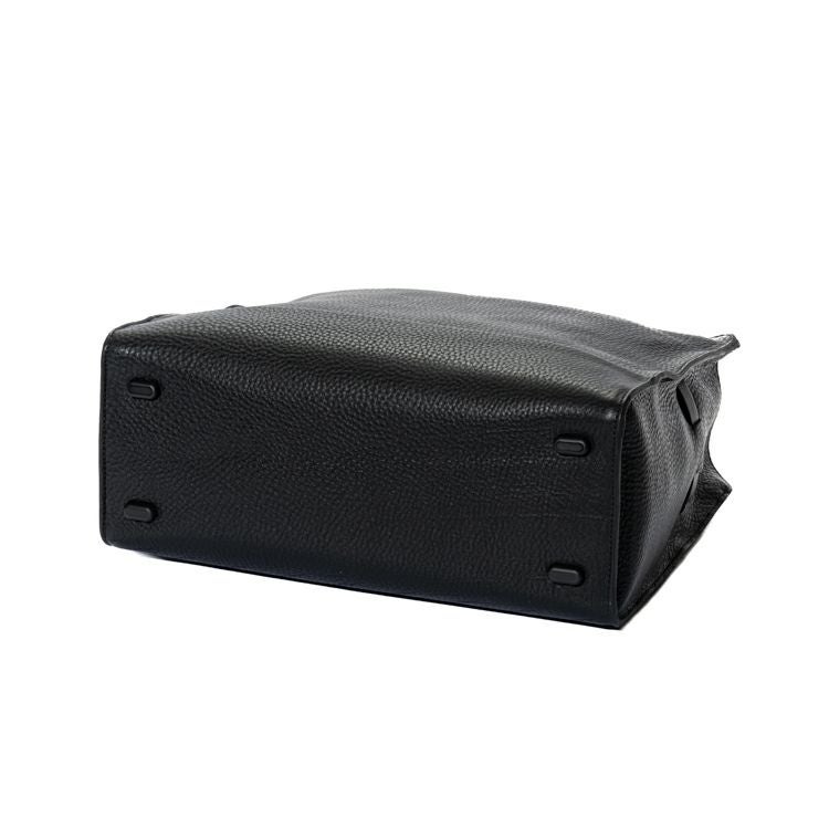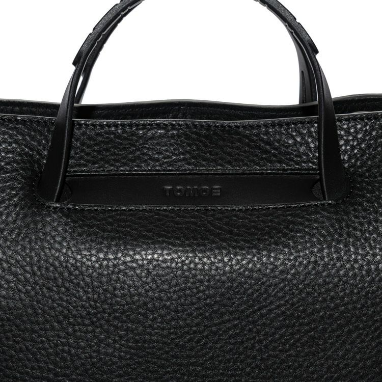 取り外し可能なヌメ革素材のショルダーストラップでトートに、バッグ上部のハンドルを使って手持ちでと、スタイルによって持ち方を変えられます。バッグ内側にマチ幅を絞る調整ベルト付きで、荷物が少ない際にマチ幅を絞り、シボ革のしなやかさが生み出す独特のドレープを楽しむもおすすめ。底面にはオリジナルの底鋲付きで床置きも安心。
