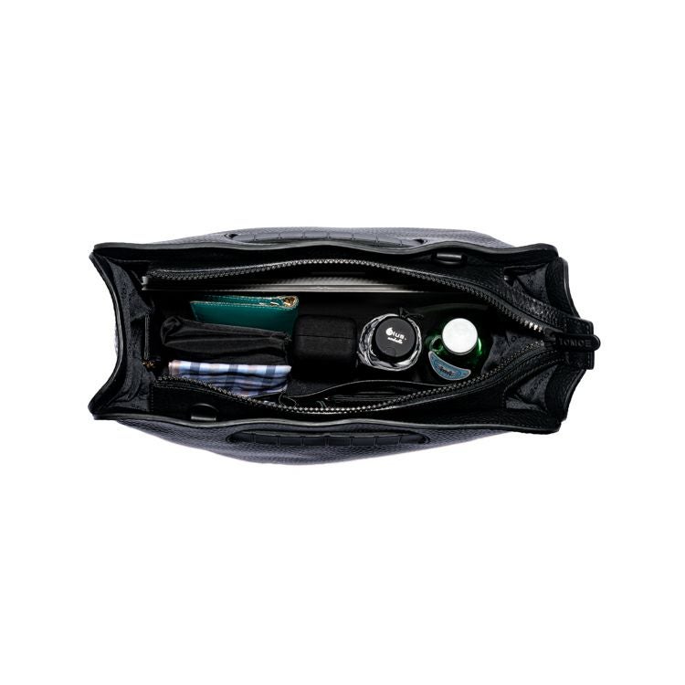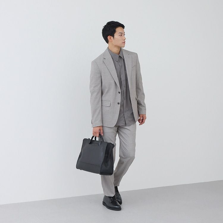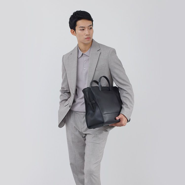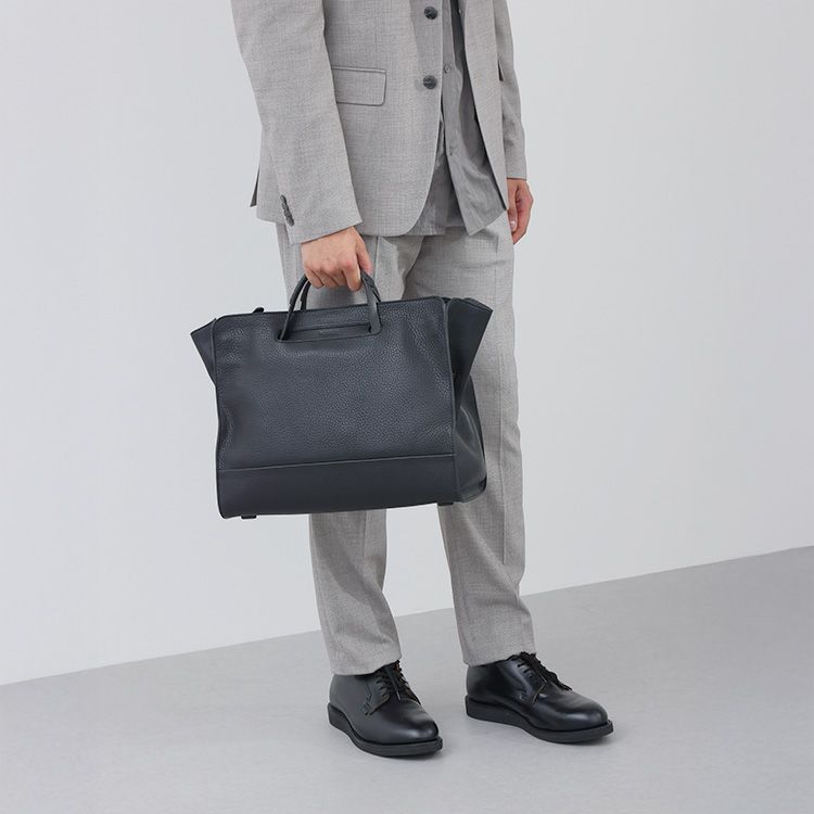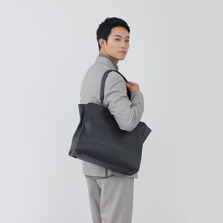 枠にとらわれないビジネスパーソンに向けた、新しいワークスタイルを提案する、2Wayレザートートバッグ。A4サイズ対応で、内側に施したマチ幅調整ベルトで荷物に合わせてフォルムを変えられます。