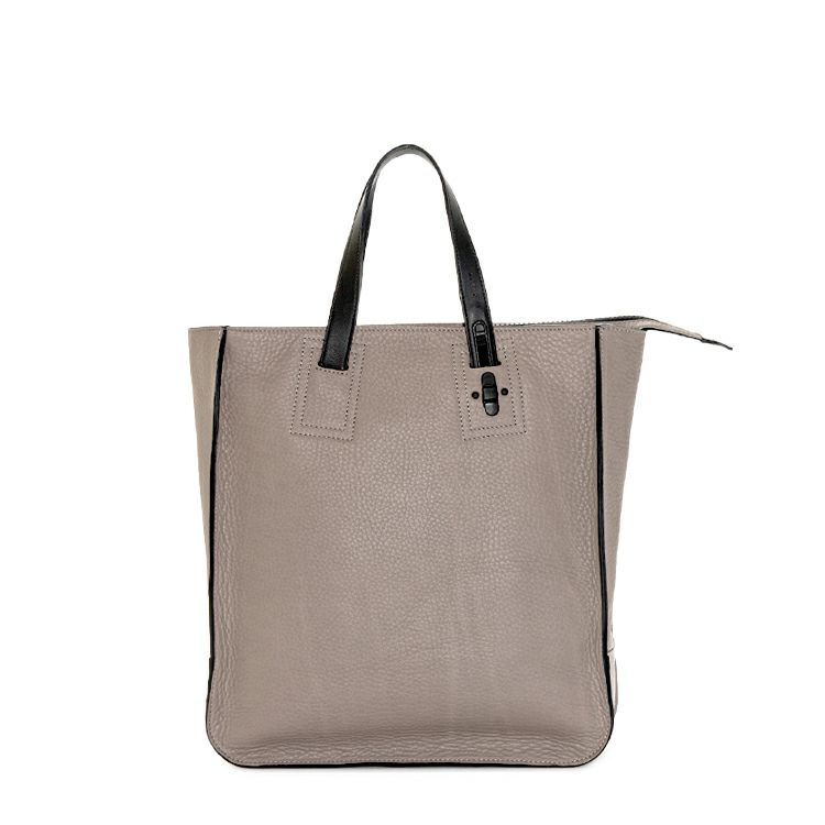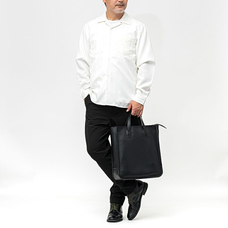 肉厚なシボ革の上質感を引き出す、スタイリッシュに仕上げた縦型レザートートバッグ。自立可能な底マチを確保し、A4ファイルや13インチPC・手回り品を持ち運べる収納力を確保。