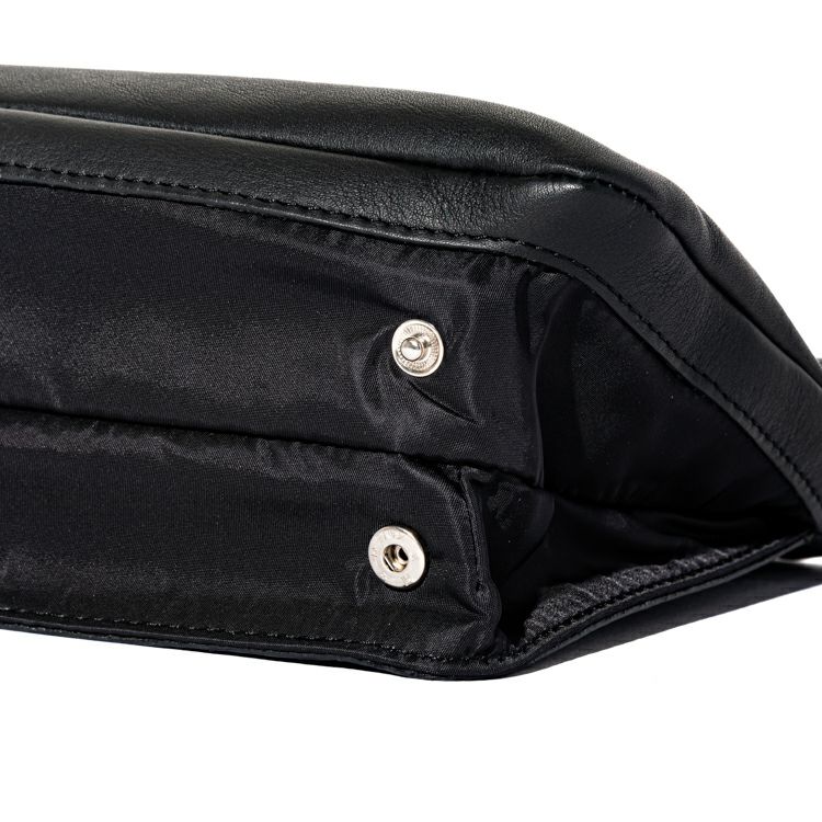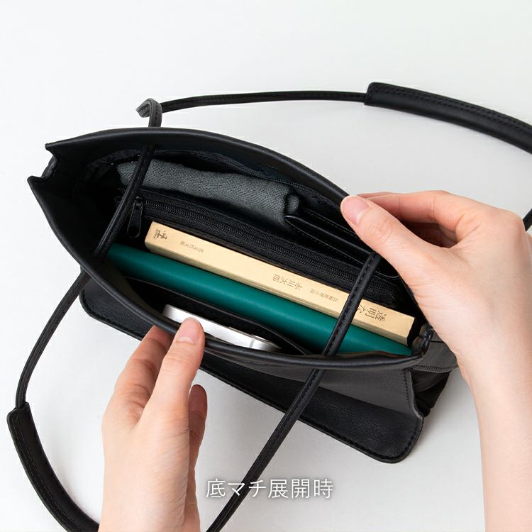 底面がスナップボタンになっており、最大10cmまでマチ幅が広がります。貴重品だけを持ち歩きたい際は薄マチでスタイリッシュに、荷物をもう少し入れたい時は底のスナップを開いて底マチを広げることで収納力がUP。
