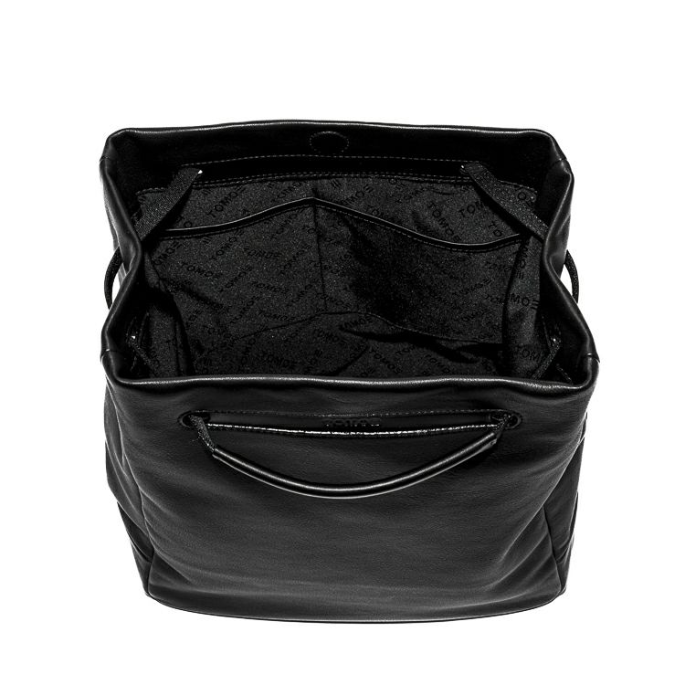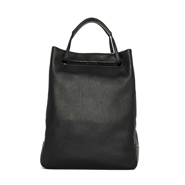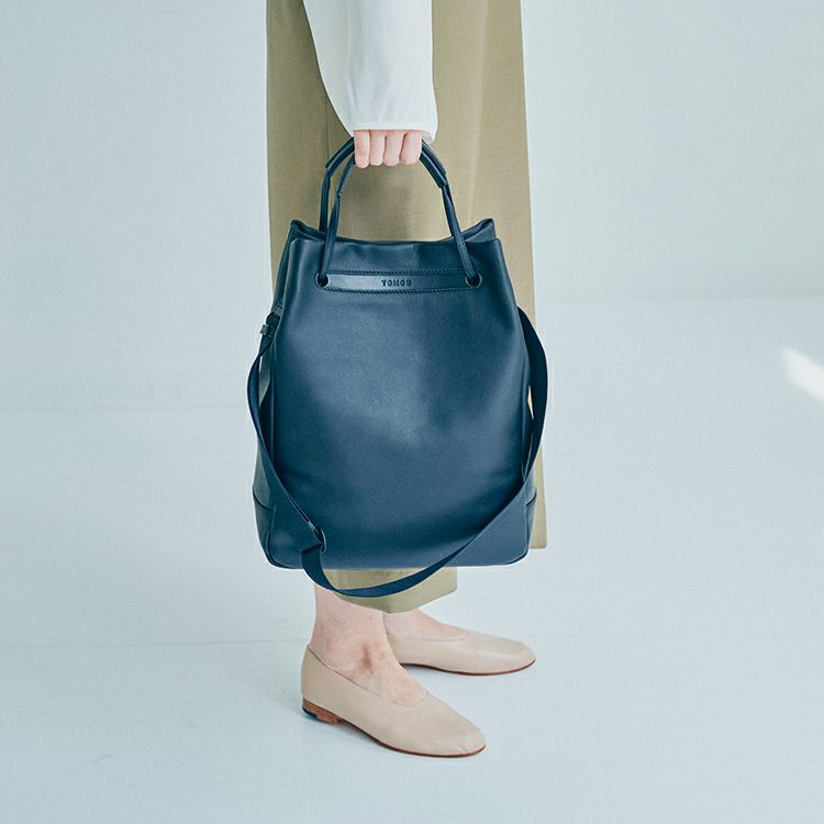 ハンドルを持ち上げるとTOMOEのロゴが顔を出します。構造のほぼ全てを革にすることで、軽さも実現。オンオフ、ジェンダーを問わない普遍性を兼ね備えたデイリーバッグです。