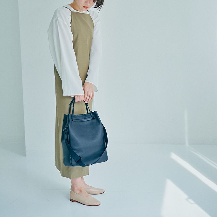 肌当たりの良い上質なソフトレザーの肌触りと、柔らかさを生かした丸みを帯びたフォルムが特徴。取り外し可能なベルトでショルダーに、ハンドルを持ち上げれば手持ちになる2Way仕様。ショルダーとハンドルそれぞれを引っ張ると自然と開口部が閉じる、実用性も考え抜かれた構造です。