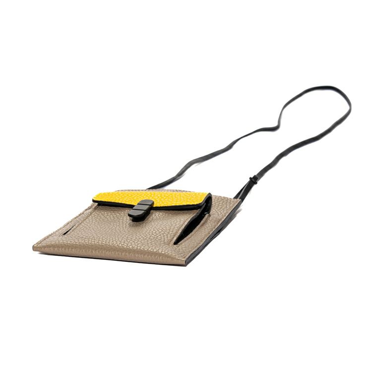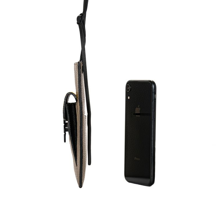 コインケースの開閉部には、独自開発したスチールクリップを使用。開閉の動作をスマートに行えます。「レザー×異素材」のハイブリットなデザインがアクセントに。スムースレザーを使ったストラップは、長さ調整可能。