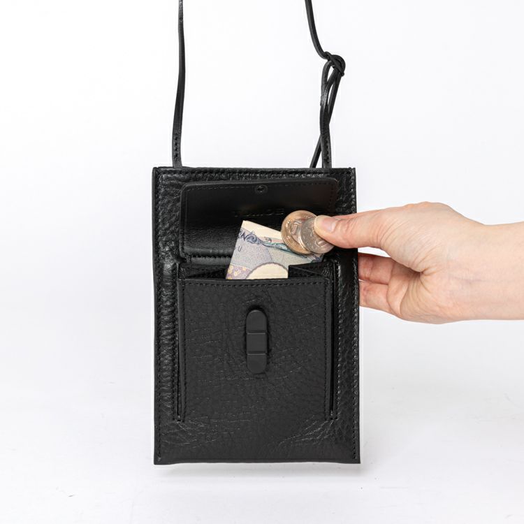 メインルームはスマホがすっぽりと入るサイズ感で、フロントのフラップポケットは硬貨と紙幣が二つ折りで収納できます。