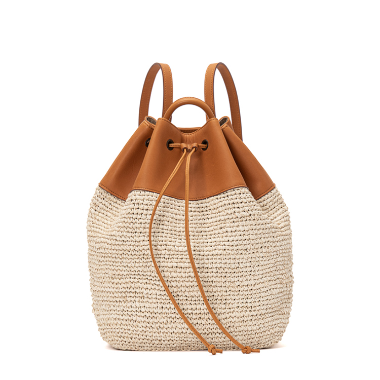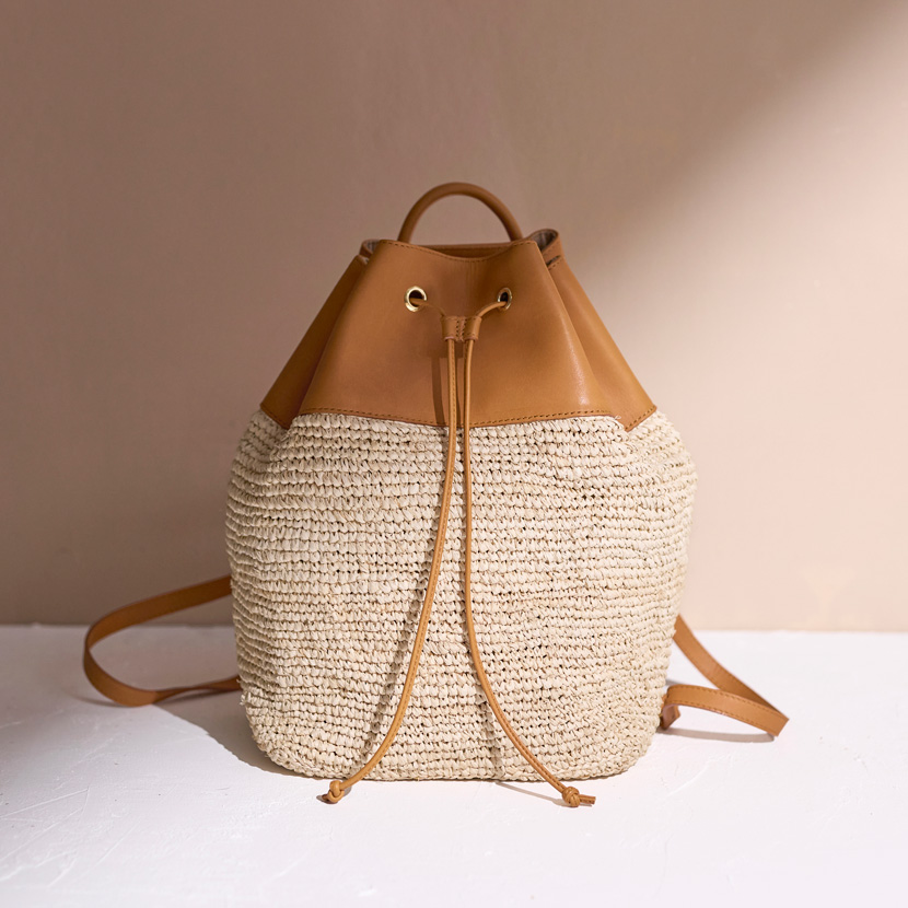 ラフィア素材の柔らかな編み目と、キャメルレザーの巾着型トップが上品に調和した女性向けの新ラインです。背負った瞬間、肩にのしかかる重さを感じません。細いレザーストラップが見た目の軽やかさをつくり、長時間のお出かけも楽にしてくれます。