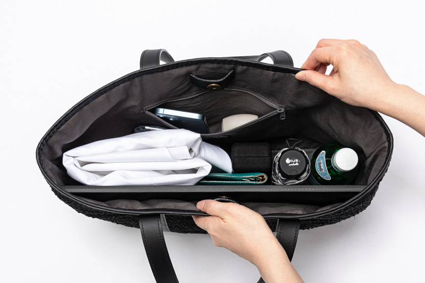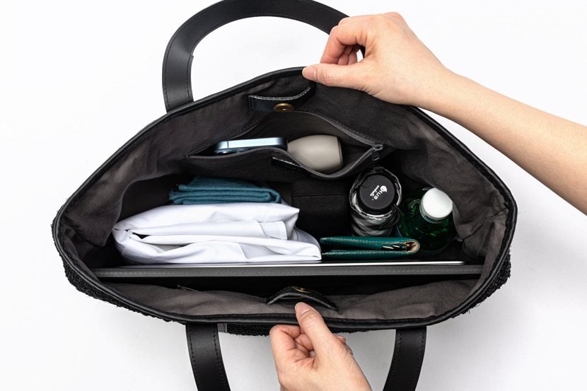 スマートな縦長フォルムながら、B4ファイルや16インチPCも収まる大容量です。背面の大判レザーポケットでスマホもサッと取り出せます。マグネットボタンで開け閉めもラクで、通勤にも1泊の出張にも頼れる一型。底びょう付きで、床に置いても安心してお使いいただけます。