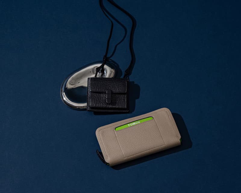 TOMOEらしい上質なシボ革に、遊び心あるカラーアクセントを効かせた長財布と、アクセサリー感覚で使えるネックウォレット。